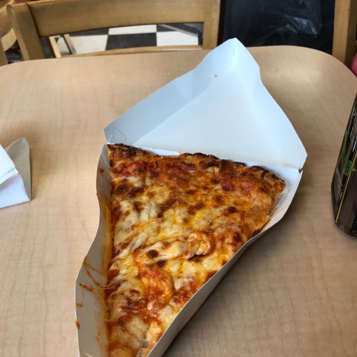 It’s greasy. It’s heavy. But it doesn’t mean it’s bad. It’s a thick slice with a great crust. What’s weird is if you buy a whole pie, it comes round but cut into squares. But if you buy slices, they come in the traditional pizza slice.